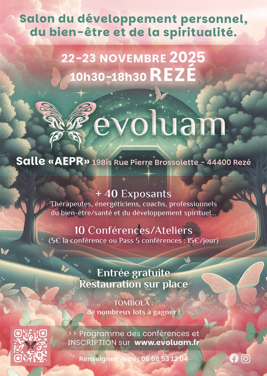 EVOLUAM met en lumière une grande variété de praticiens en développement personnel, bien-être, spiritualité pour accompagner le grand public dans son évolution personnelle. Les salons ont lieu majoritairement en région nantaise et Pays de la Loire.