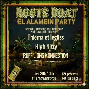 2025-12-13 20:00:00 2025-12-13 23:55:00 Europe/Paris SAM 13/12 : ROOTS BOAT PARTY - Ruff Lions+Thiema&Legus+Zion Head Reservations on : https://www.billetweb.fr/sam-13-12-roots-boat-party -- THIÈMA LÊGÜSS : Six musiciens pour une fusion musicale dans laquelle les influences du reggae, du hip-hop, et du rock s’entrelacent à la chanson française. ZION HEAD AND HIGH NITTY BAND : Enfance jamaicaine, exil anglais, Zion Head, en France depuis 2013, démontre qu’il a la voix, le son et les paroles pour devenir l’un des artistes remarquables de la musique reggae consciente et positive. RUFF LIONS: Reggae, ska, ragga, dub…De la ’Roots music’ d’espoir, de respect, de tolérance et d’unité portée par des textes en français. Bateau El Alamein, Port de la Gare, Paris, France bateau el alamein