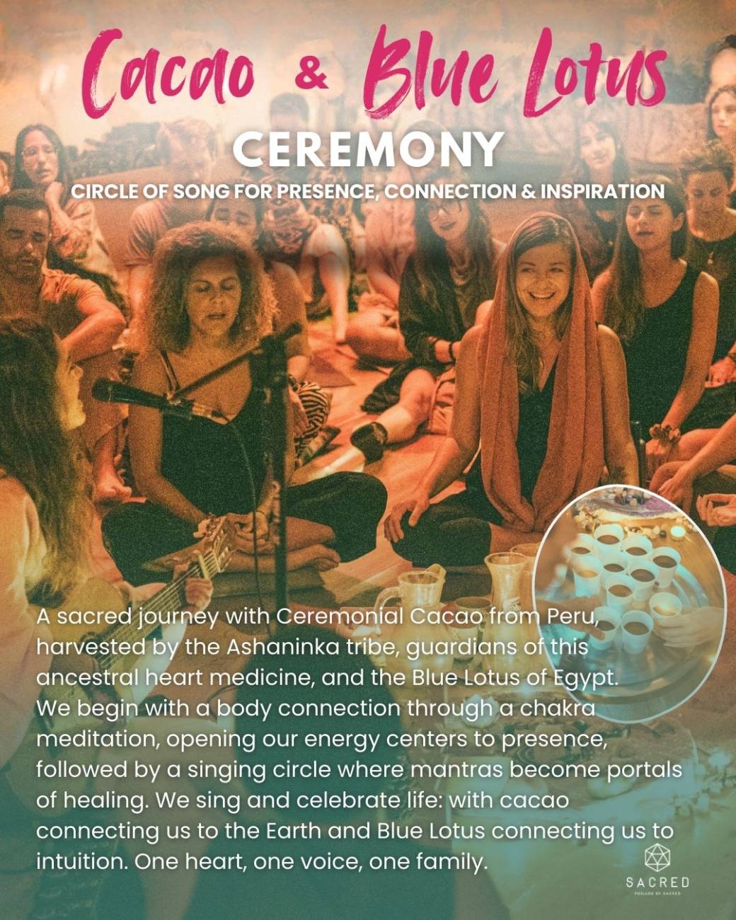 We will begin with a ceremonial cacao from the Amazon, gently opening the heart and grounding us in the body, infused with Blue Lotus: a sacred flower known for its calming and intuitive qualities, inviting softness, inner expansion and deep listening.