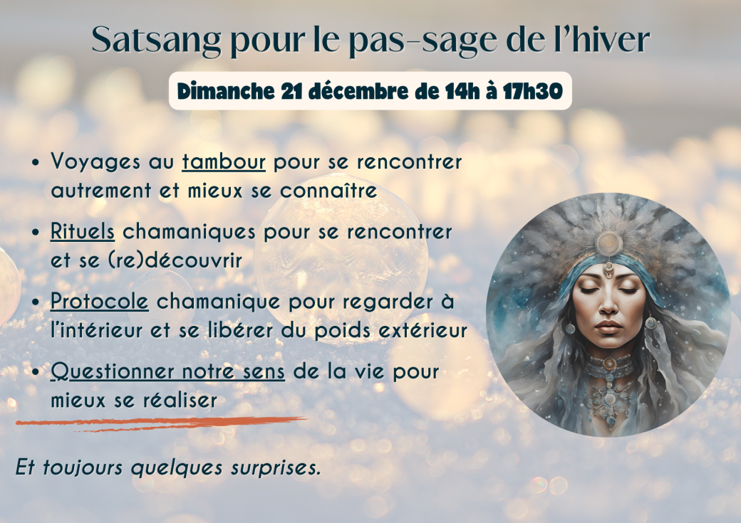 Pendant 3h30, le dimanche 21 décembre, je vous invite à plonger dans une demi-journée chamanique unique intitulée « Satsang pour l'hiver » pour naviguer en compagnie de ces énergies.