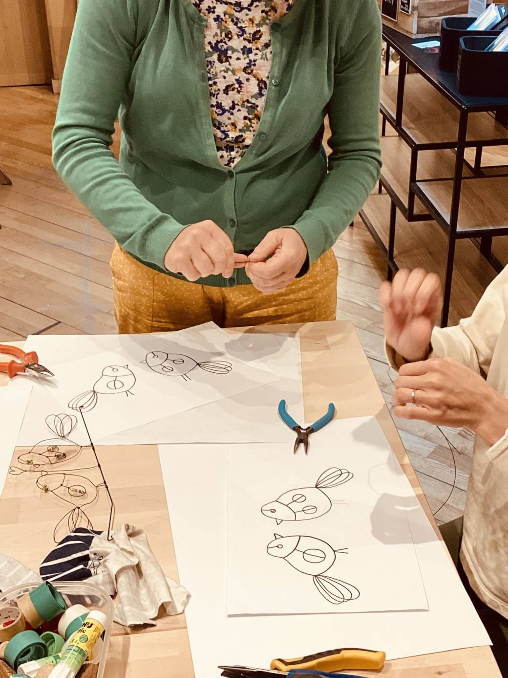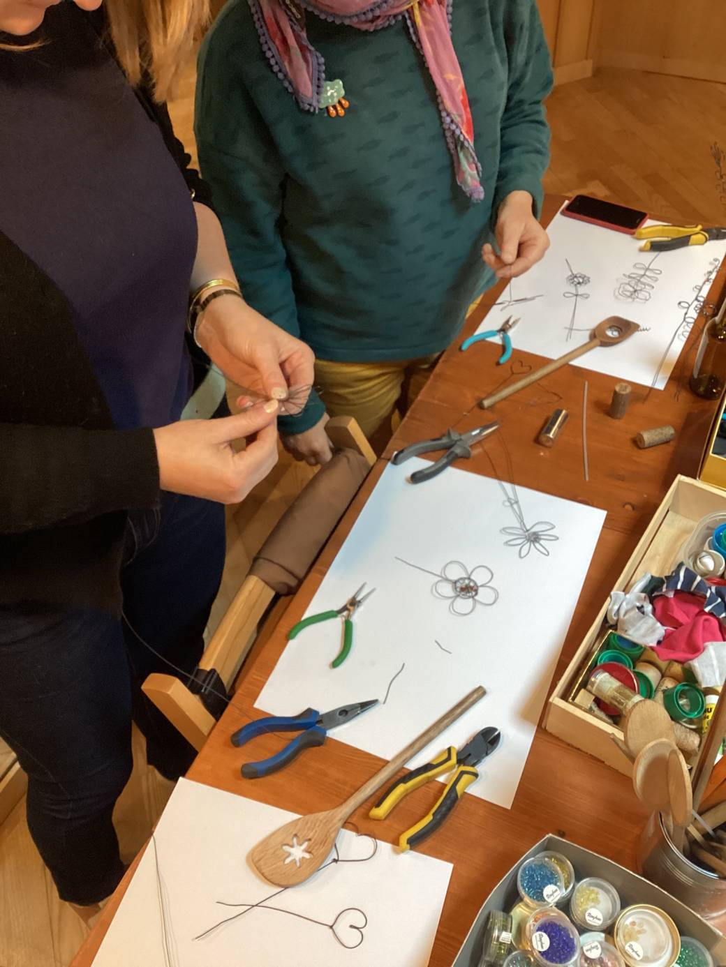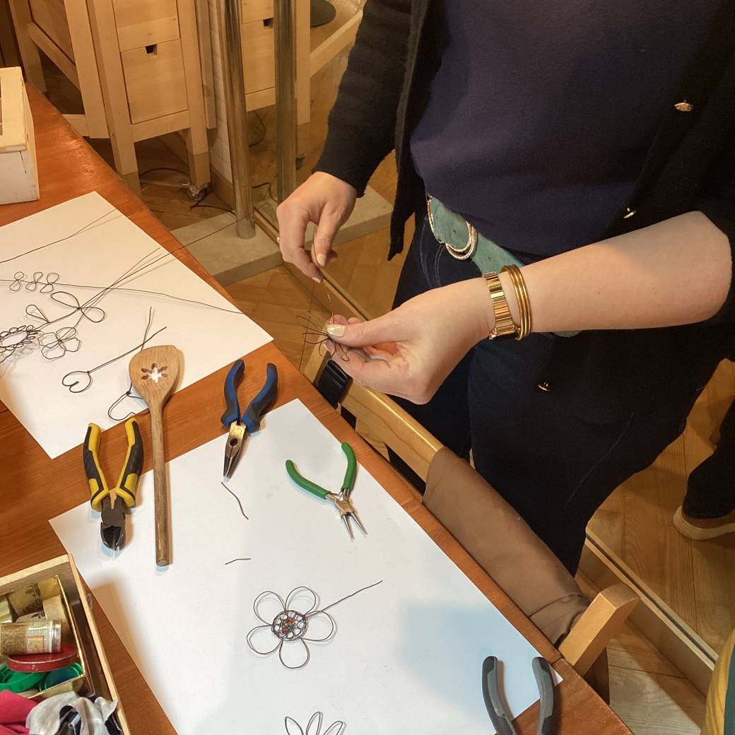 Lors de cet atelier, Delphine montre et explique au stagiaire le maniement du fil de fer avec les mains et les pinces.
