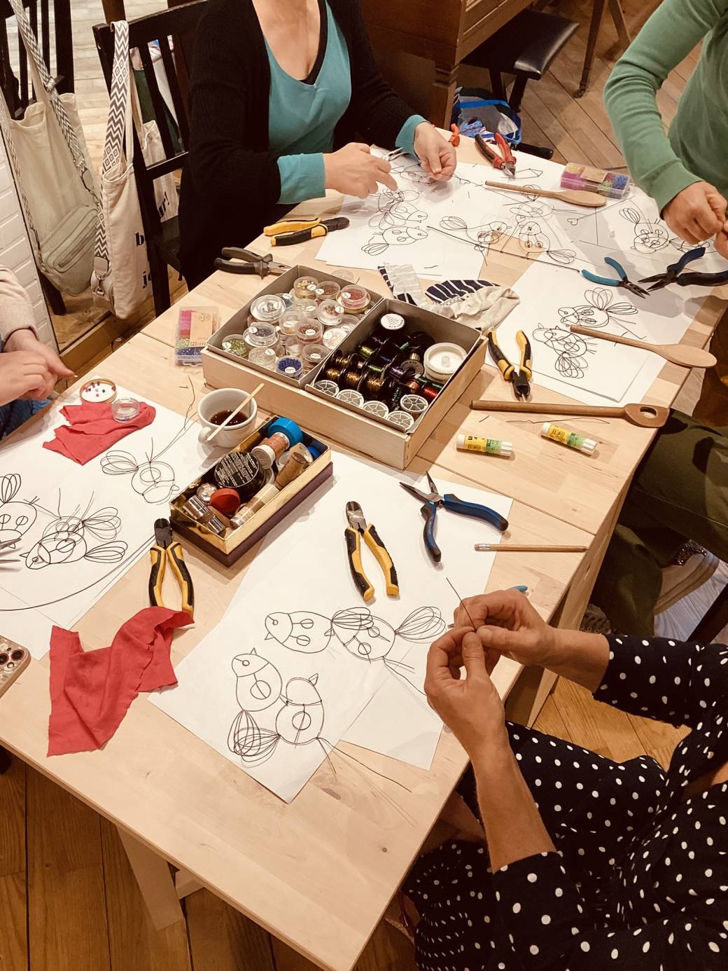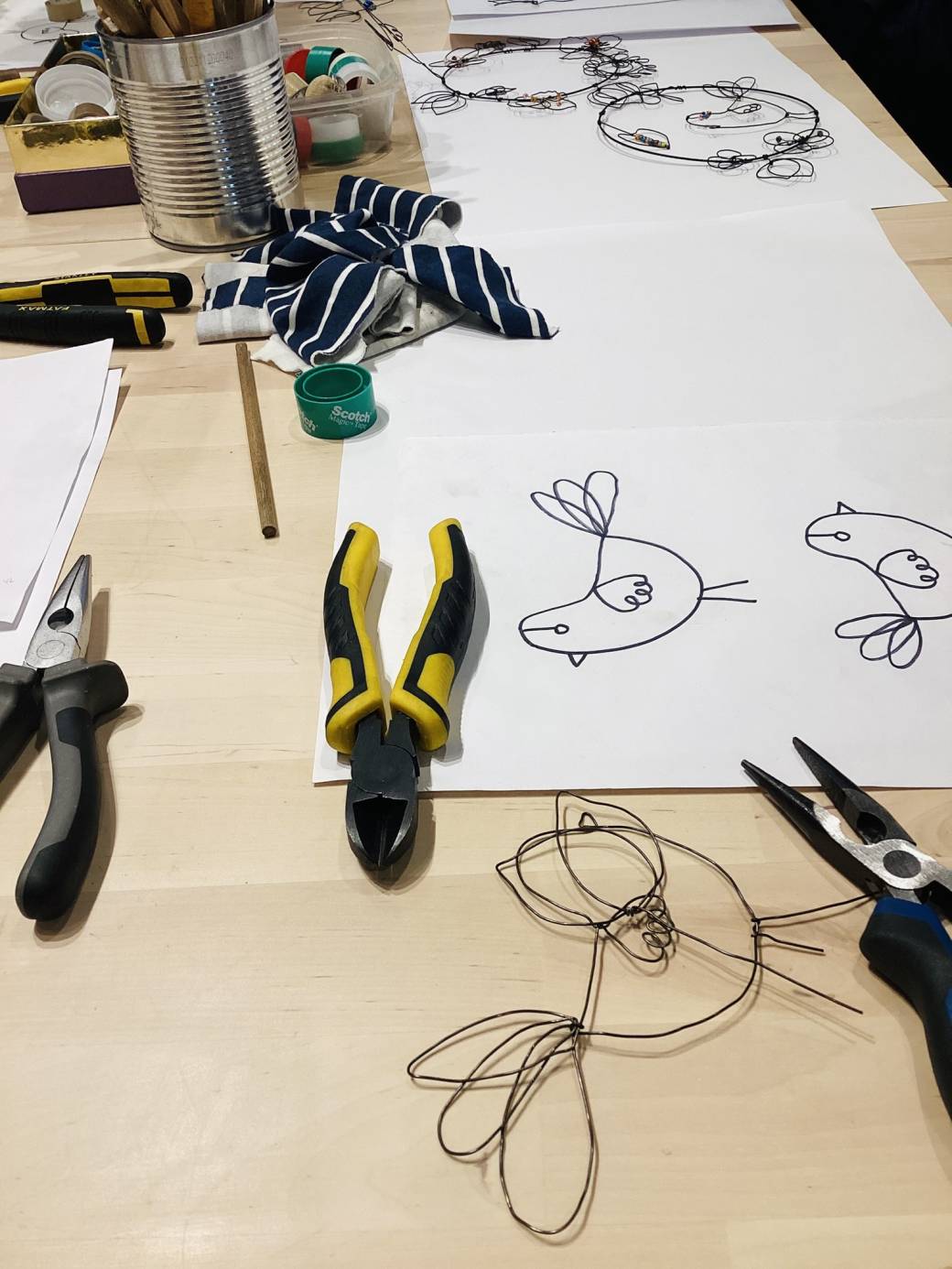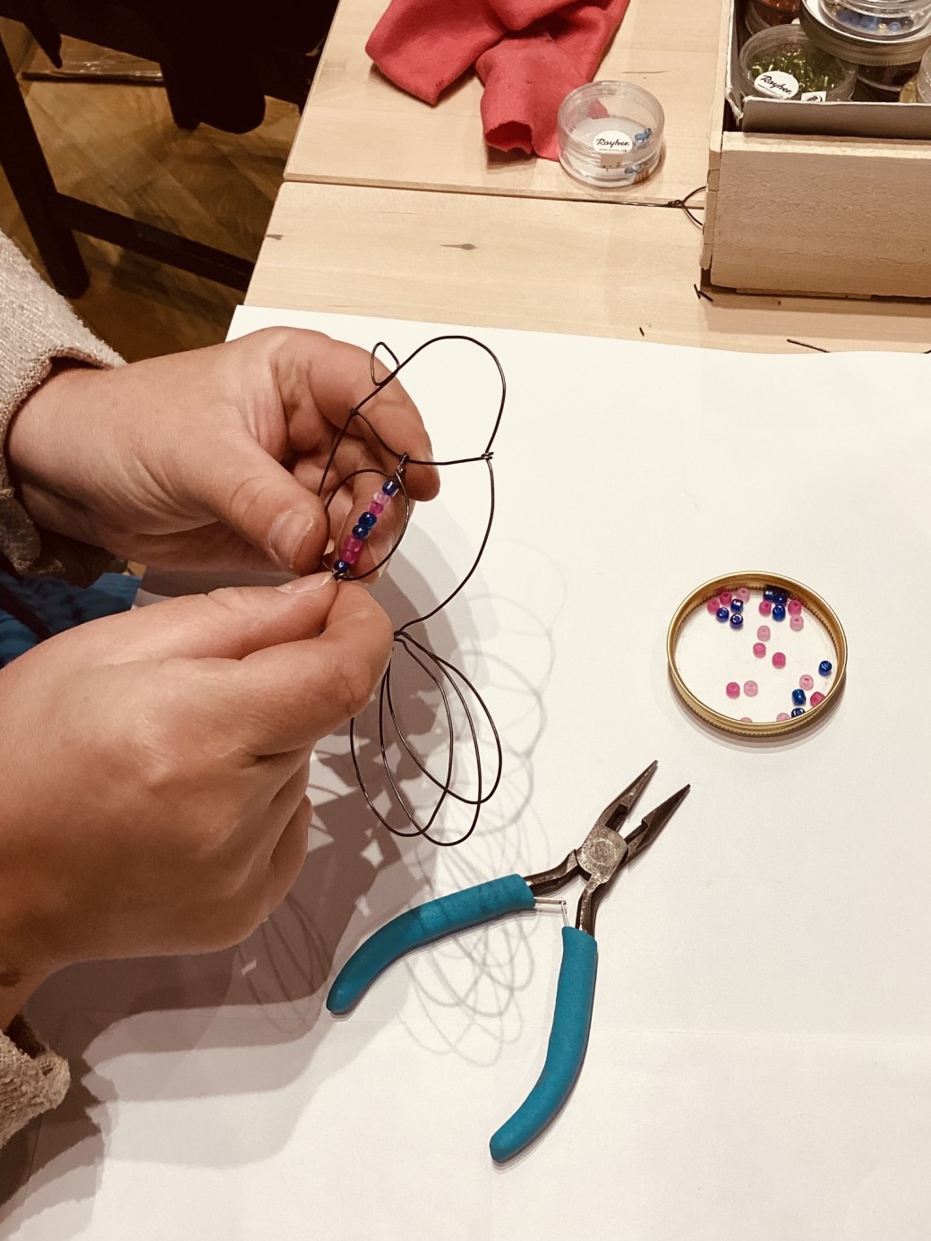 Lors de cet atelier, Delphine montre et explique au stagiaire le maniement du fil de fer avec les mains et les pinces.