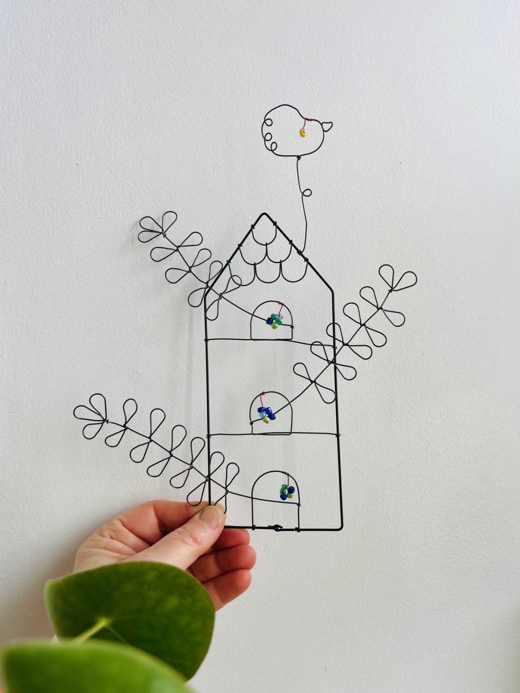 Lors de cet atelier, Delphine montre et explique au stagiaire le maniement du fil de fer avec les mains et les pinces pour réaliser une maison végétale.