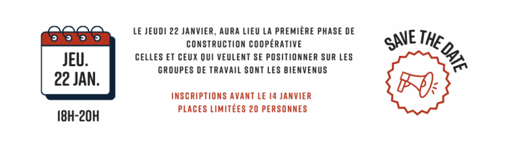2026-01-22 18:00:002026-01-22 20:00:00Europe/ParisSe revoir le 22 janvier pour créer les groupes de travailReservations on : https://www.billetweb.fr/se-revoir-le-22-janvier-pour-creer-les-groupes-de-travail