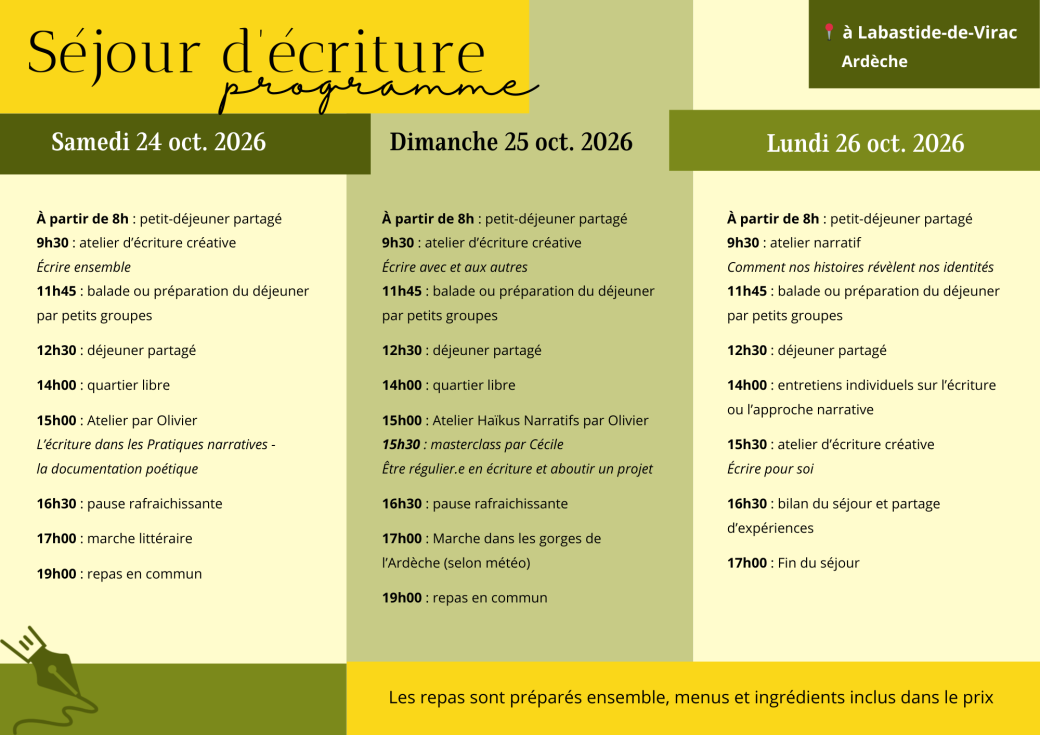 Nourris par diverses pratiques liées à l’écriture, nous vous proposons de venir expérimenter des ateliers d’écriture créative et de pratiques narratives. Au sud de l’Ardèche, nous vous accueillons dans une maison familiale simple et confortable pour un séjour ressourçant. Dans un petit groupe pour des échanges riches et stimulants, vous êtes les bienvenu.e.s avec vos envies, vos projets ou simplement votre curiosité. Venez vivre cette expérience immersive et joyeuse pour explorer comment l’écriture nous relie aux autres et à nous-même.