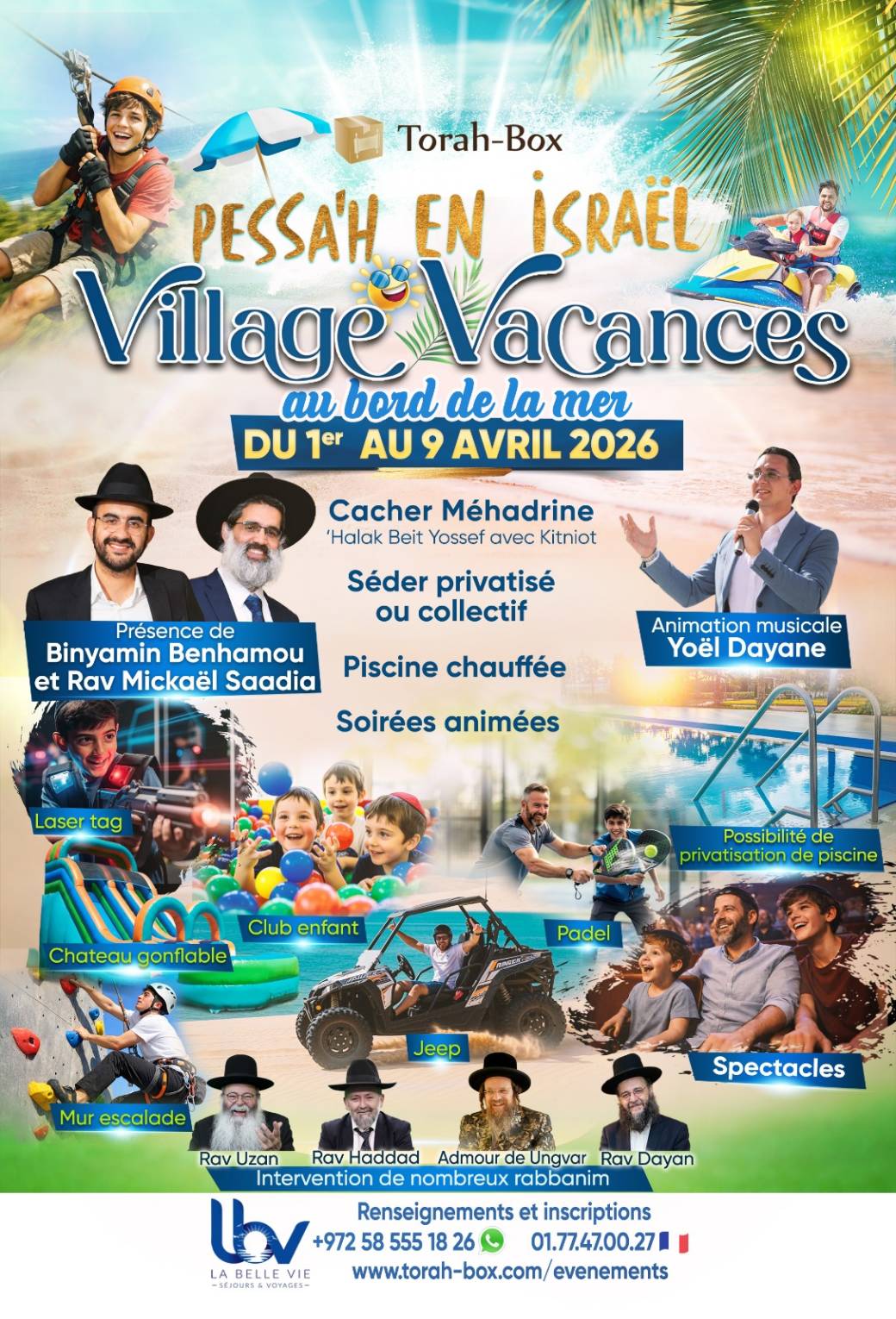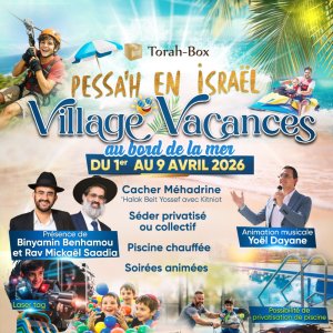 Pessa’h en Israël, dans un village vacances proche de la mer, avec piscines publiques ou privatisables, terrains de padel, clubs pour enfants, et la présence de Rabbanim de Torah-Box. Séder de Pessa’h public ou privé, au choix. Cacherout Mehadrin avec Kitniot.