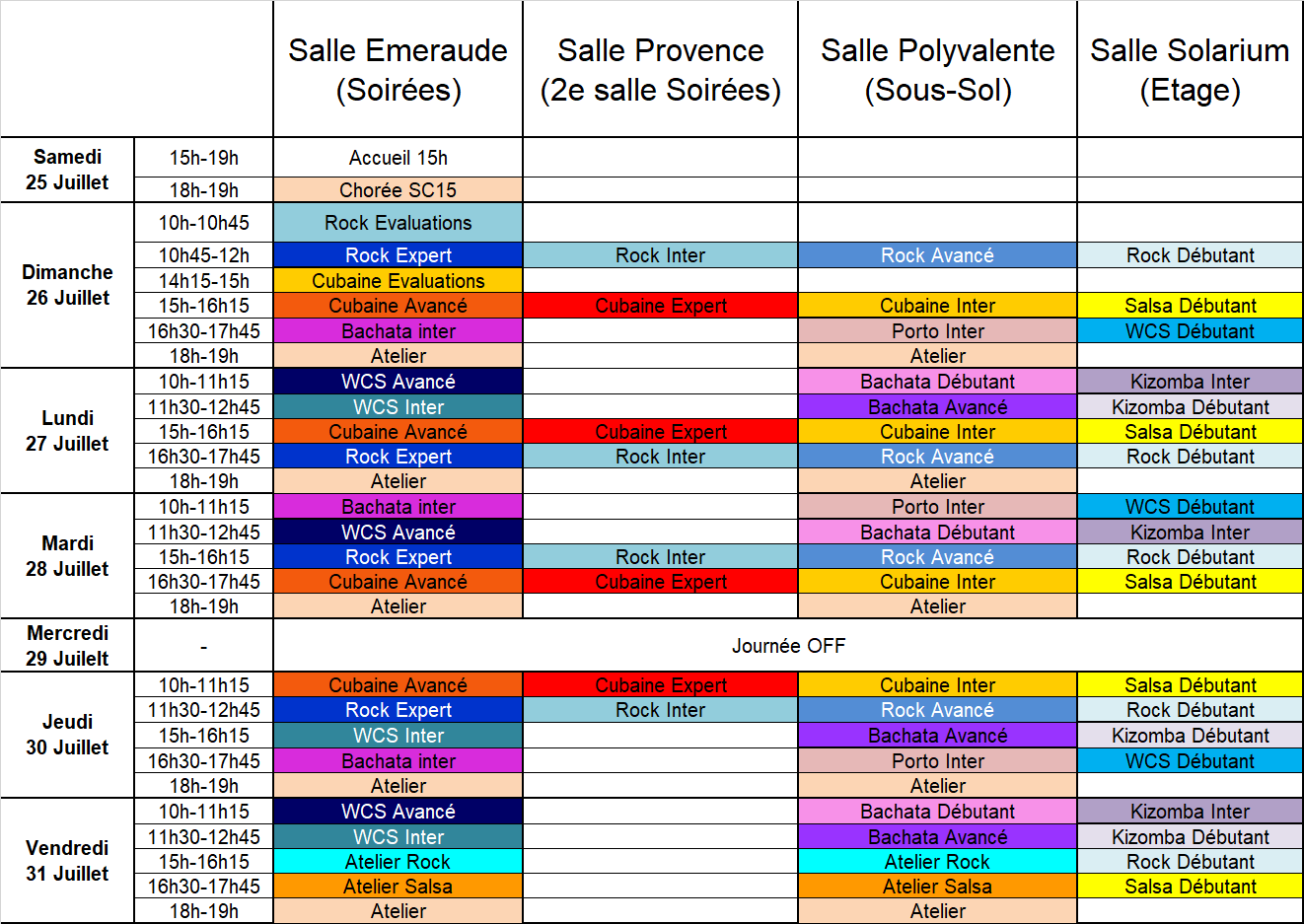 Les danses enseignées tout au long du stage sont le Rock & Roll, la Salsa Cubaine et Portoricaine, la Bachata, le West Coast Swing, le Lindy Hop et la Kizomba.