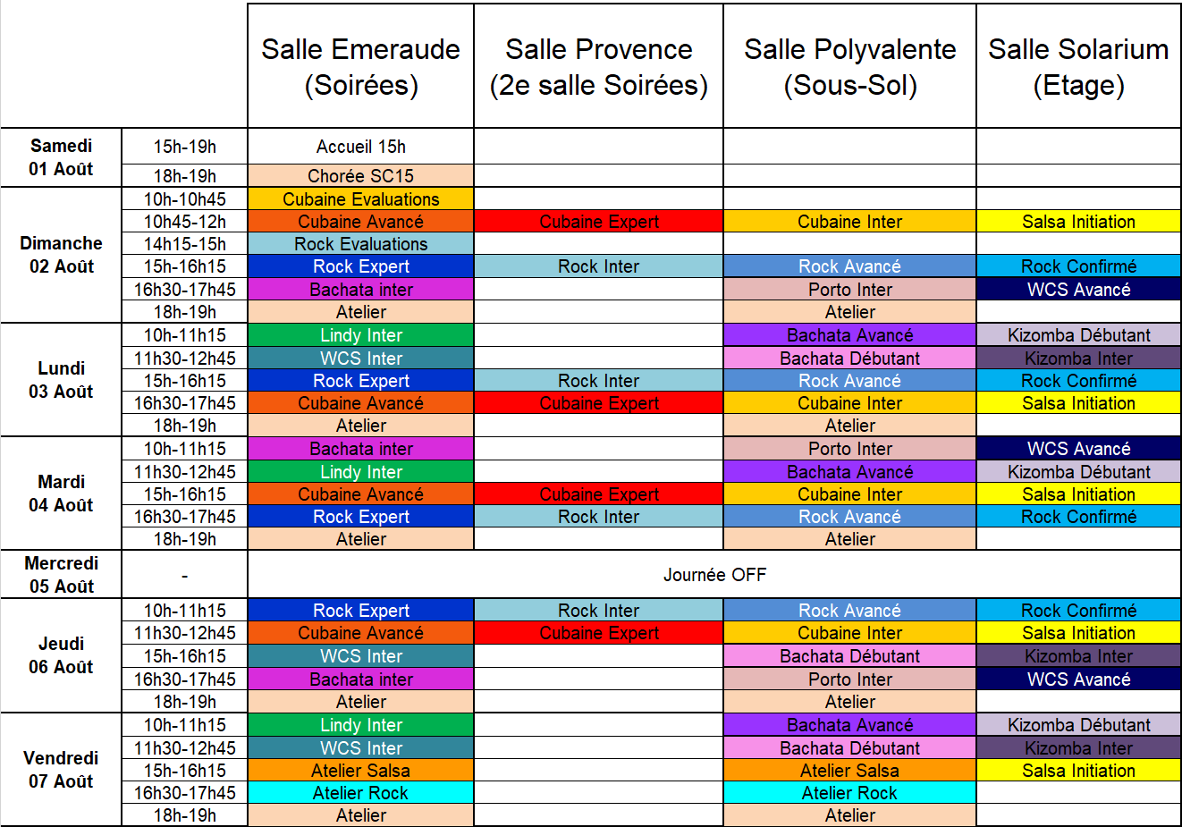 Une journée classique comporte jusqu’à 4 cours de 1h15 "Couple" et 1h d’atelier "Solo" de 18h à 19h.