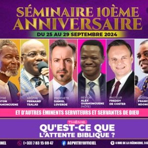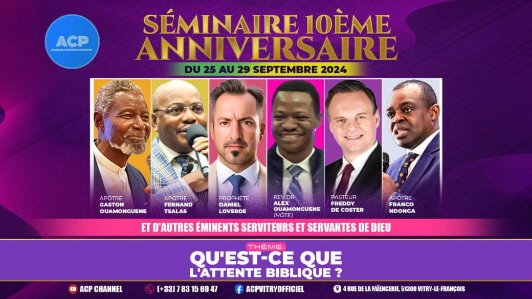 L'Ambassade Chrétienne Pentecôtiste vous convie, du mercredi 25 au dimanche 29 septembre 2024, pour célébrer son 10ème Anniversaire à l'occasion d'un séminaire intitulé "Qu'est-ce que l'Attente Biblique?".