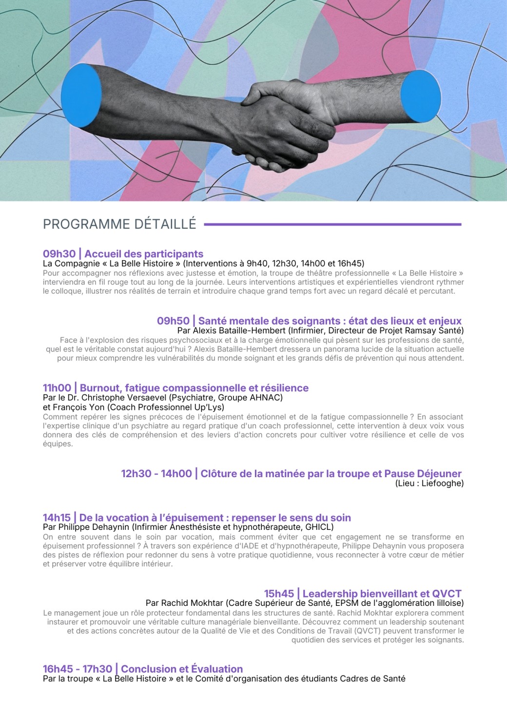 Organisé par les étudiants Cadres de Santé de l'IFCS (Université Catholique de Lille / FMMS), ce séminaire d'une journée a pour vocation de briser le tabou de la culture du « on doit tenir ». Leur conviction : Améliorer la qualité de vie et des conditions de travail (QVCT) est indissociable de la qualité et de la sécurité des soins.