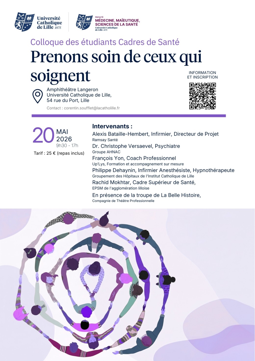 2026-05-20 09:00:00 2026-05-20 17:30:00 Europe/Paris Colloque des étudiants Cadres de Santé - Prenons soin de ceux qui soignent Reservations on : https://www.billetweb.fr/seminaire-des-etudiants-cadres-de-sante-prenons-soin-de-ceux-qui-soignent -- Aujourd’hui, les professionnels de santé exercent dans un contexte de tensions majeures. Avec 98 % des soignants déclarant avoir déjà ressenti des symptômes d'épuisement professionnel et près de 50 % des infirmières hospitalières quittant leur poste dans leurs dix premières années, la santé mentale des équipes est devenue un impératif de santé publique.   Organisé par les étudiants Cadres de Santé de l'IFCS (Université Catholique de Lille / FMMS), ce séminaire d'une journée a pour vocation de briser le tabou de la culture du « on doit tenir ». Leur conviction : Améliorer la qualité de vie et des conditions de travail (QVCT) est indissociable de la qualité et de la sécurité des soins.   À travers des regards d'experts (scientifiques, cliniques et managériaux) et des médiations expérientielles, cette journée vous invite à repenser le sens du soin, à identifier les leviers de prévention de l'épuisement, et à promouvoir un leadership bienveillant. Parce que pour soigner les autres, il fau… Amphithéâtre Langeron - Université Catholique de Lille, 54 rue du Port, Lille Corentin Soufflet