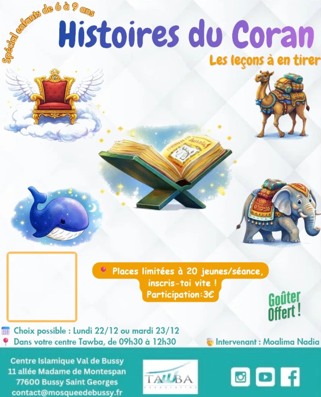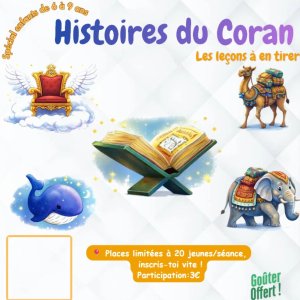 2025-12-22 09:30:002025-12-23 12:30:00Europe/ParisSéminaire enfants: Histoires dans le Coran (6 à 9 ans)Reservations on : https://www.billetweb.fr/seminaire-pour-enfants-theme-histoires-dans-le-coran-6-a-9-ans