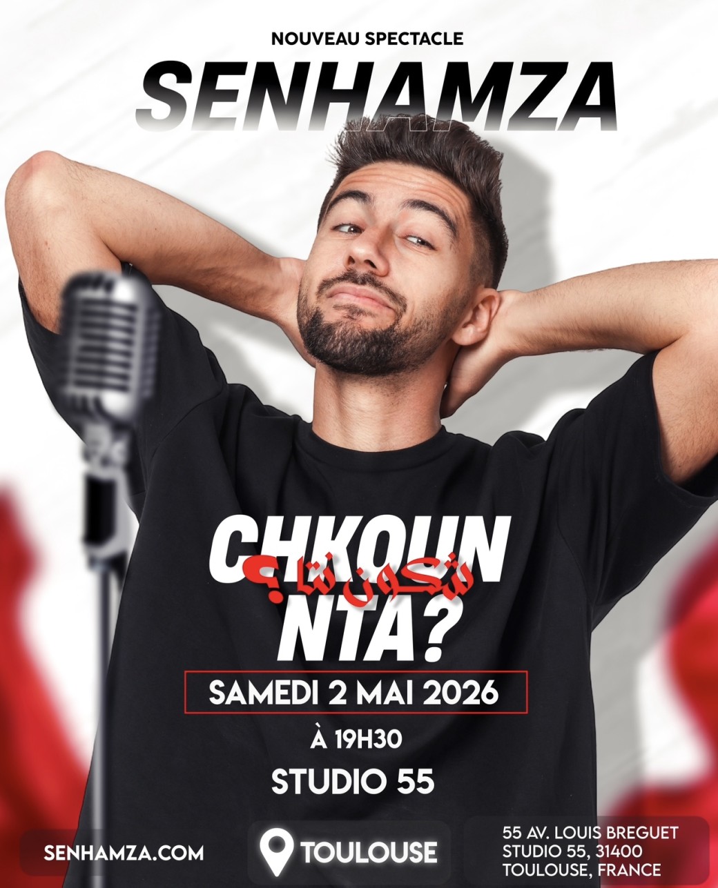 2026-05-02 19:30:00 2026-05-02 19:30:00 Europe/Paris SENHAMZA - CHKOUN NTA AU STUDIO 55 TOULOUSE Reservations on : https://www.billetweb.fr/senhamza-chkoun-nta-au-studio-55-toulouse -- « CHKOUN NTA » marque le premier spectacle de Hamza.  Suivis par plus de 3 millions de followers sur les réseaux sociaux, SENHAMZA sort enfin des écrans pour monter sur scène. Il y racontera son histoire, des échecs aux succès, et vous invitera à voyager à travers son parcours exceptionnel, de son enfance au Maroc à son arrivée en France, jusqu'à son ascension fulgurante sur Internet.  55 Av. Louis Breguet studio 55, 31400 Toulouse, France HS ENTERTAINMENT
