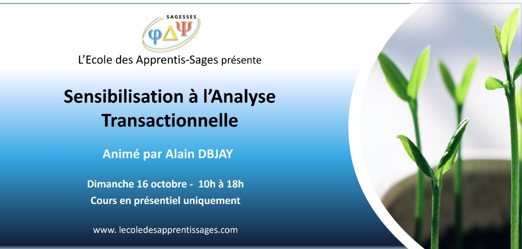 2022-10-16 10:00:00 2022-10-16 18:00:00 Europe/Paris Sensibilisation à l’Analyse Transactionnelle Reservations on : https://www.billetweb.fr/sensibilisation-a-l-analyse-transactionnelle -- Intervenant : Alain DBJAY, psychothérapeute en Analyse Transactionnelle.Thème : L’analyse Transactionnelle fait certainement partie avec la Gestalt thérapie et l’Approche centrée sur la personne (ACP), des trois écoles les plus connues de la Psychologie Humaniste. Éric Berne son fondateur, influencé par la psychanalyse, a voulu créer une thérapie abordable et compréhensible, même pour un enfant de 8ans. Très facile d’accès mais profonde dans ses développements, l’Analyse Transactionnelle séduit par ses concepts clairs et imagés et ses nombreuses métaphores.   En présentiel L'Ecole des Apprentis-Sages