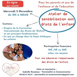 2025-11-19 21:00:00 2025-11-19 22:30:00 Europe/Paris Sensibilisation aux droits de l'enfant Reservations on : https://www.billetweb.fr/sensibilisation-aux-droits-de-lenfant1 -- Pas facile d'accompagner les enfants à grandir. Entre en vouloir et les avoir, parfois, il y a un monde ! Et puis, on peut se sentir perdu sur comment faire pour les éduquer. Et là,  les débats sur les différentes méthodes éducatives qui fusent dans les médias ne nous aident pas à choisir. Pourtant il existe la Convention Internationale des Droits de l’Enfant (CIDE) qui peut être un véritable repère en éducation.  C'est un cadre légal depuis que la France l’a ratifié en 1990 et si l'on s'y penche dessus, elle permet d’amener plus de cohésion entre adultes sur la façon d'accompagner les enfants. Trop peu de personnes connaissent cette convention, pourquoi elle a vu le jour et ses grands principes sur lesquels on peut s’appuyer pour prendre des décisions dans l’intérêt de l’enfant. C’est pourquoi je vous propose cet atelier en ligne  sur zoom. Nous verrons de manière interactive et ludique : Quelle est l’origine de la CIDE et ses grands principes. Qu’est-ce que les droits de l’enfant … - Isabelle Rousseau - Parentalité et Communication