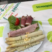 1 assiette d'asperges avec son duo de jambon, accompagné de 2 sauces
