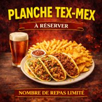 2 tacos volaille marinés citron + 1 tacos bœuf épicé + frites + nachos nature ou cheddar + dessert - Réservation ouverte jusqu'au 05/04 inclus.