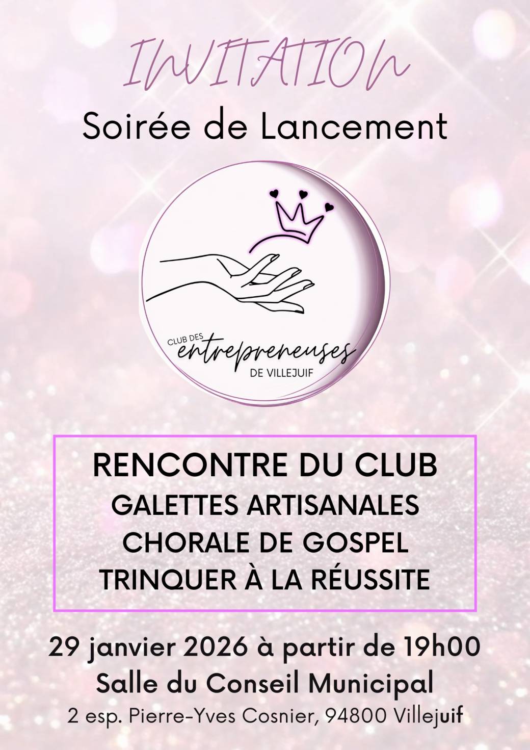 2026-01-29 19:00:002026-01-29 22:00:00Europe/ParisSoirée de lancement du Club des Entrepreneuses de VillejuifReservations on : https://www.billetweb.fr/soiree-de-lancement-du-club