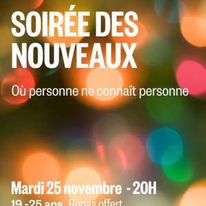 2025-11-25 20:00:00 2025-11-25 22:00:00 Europe/Paris Soirée des nouveaux Reservations on : https://www.billetweb.fr/soiree-des-nouveaux -- La fameuse soirée où personne ne connaît personne !  Une soirée spécialement pensée pour ceux qui n'osent pas venir seuls ! Ici, tout le monde le sera.  Pas d'excuses !  Mardi 25 novembre à 20h Suivi d'un repas offert 19-25 ans Inscription obligatoire : olami-cadet-nation.fr   - Olami Nation