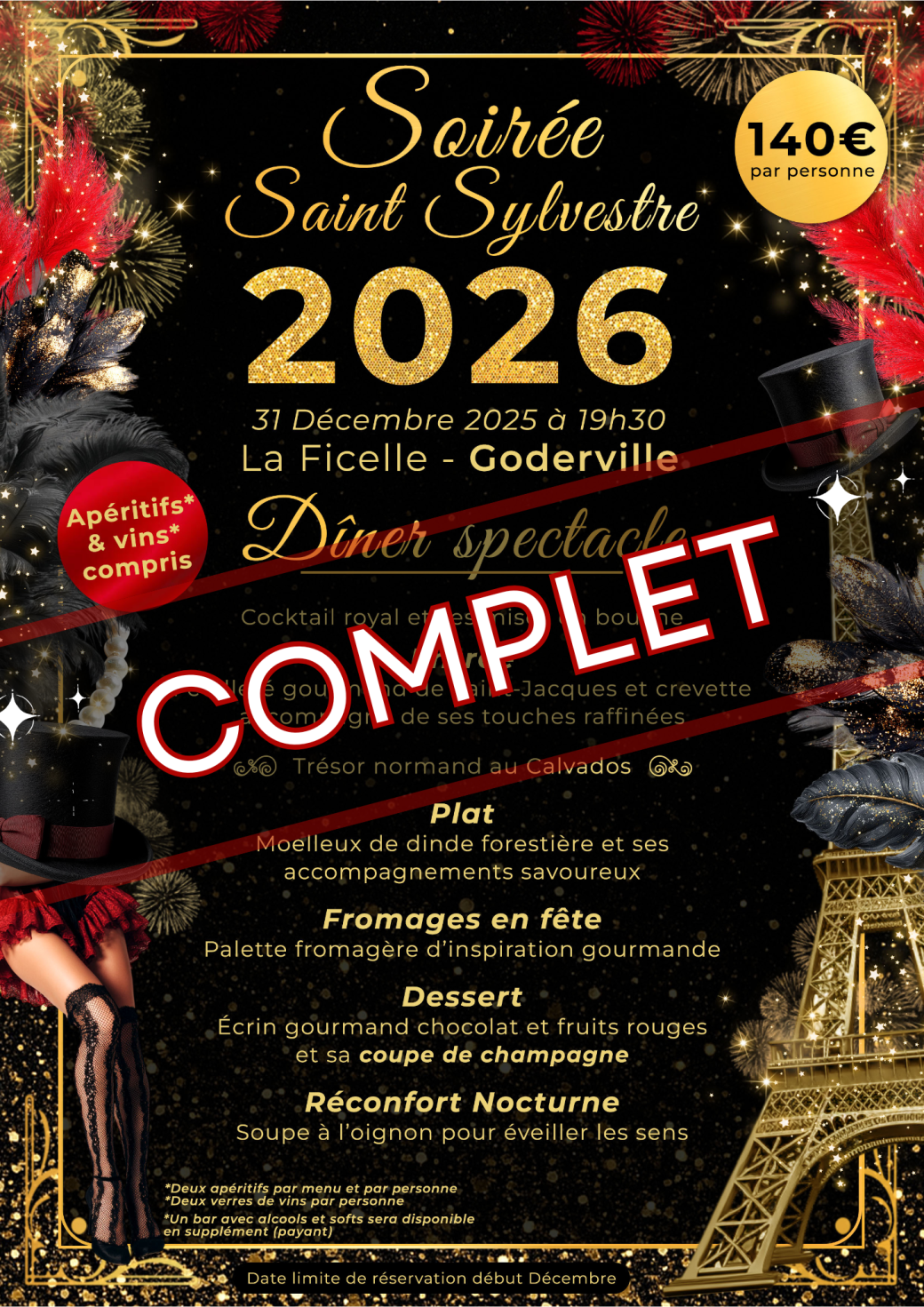 Le tout accompagné d’un somptueux dîner concocté pour l’occasion, puis d’une grande soirée dansante animée par notre DJ, pour célébrer le passage à la nouvelle année dans une ambiance festive et scintillante.