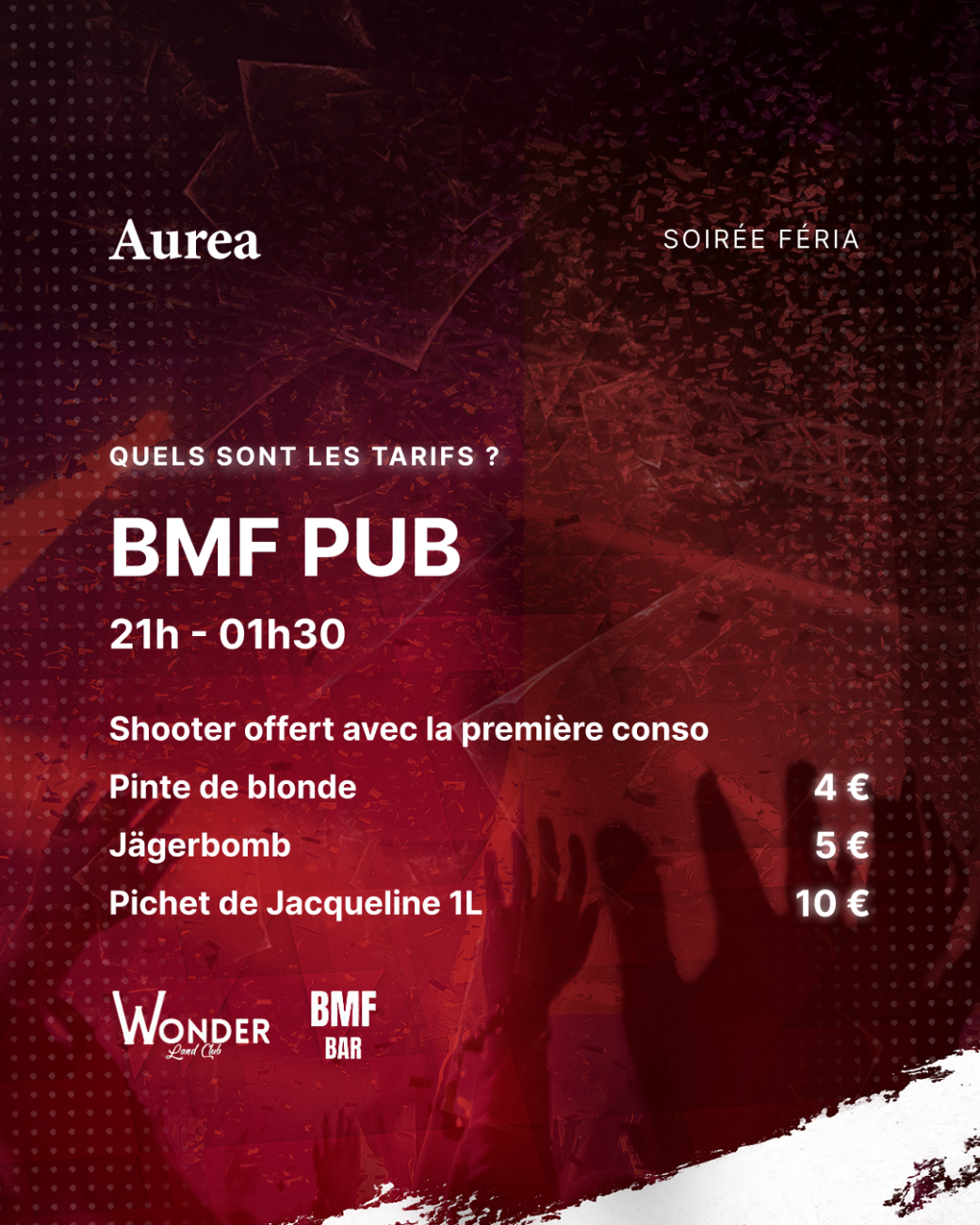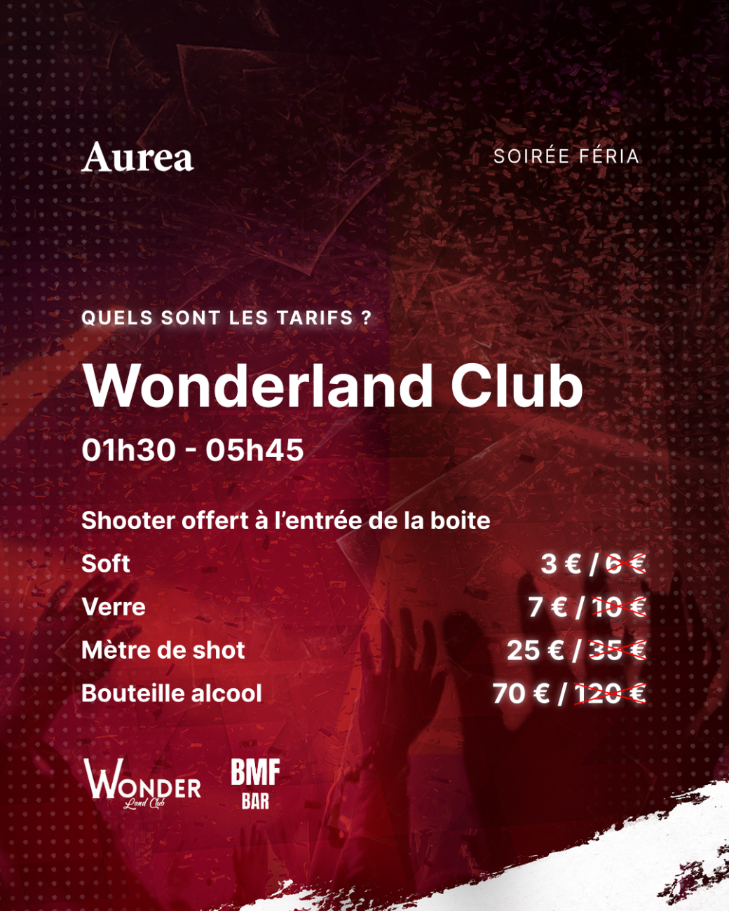On commence au BMF PUB dès 21h, before officiel de la soirée, puis after géant au Wonderland Club à partir de 01h30.