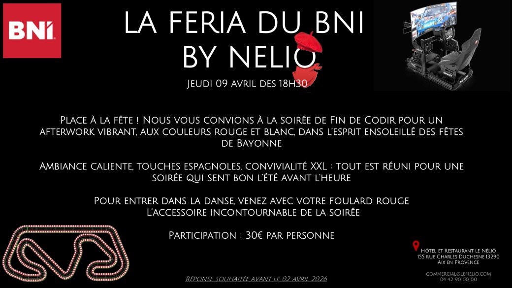 Pour fêter le changement de mandat et nous retrouver tous autour d'une soirée festive, le BNI Synergie Provence, organise sa soirée de fin de mandat le jeudi 9 avril au NELIO.