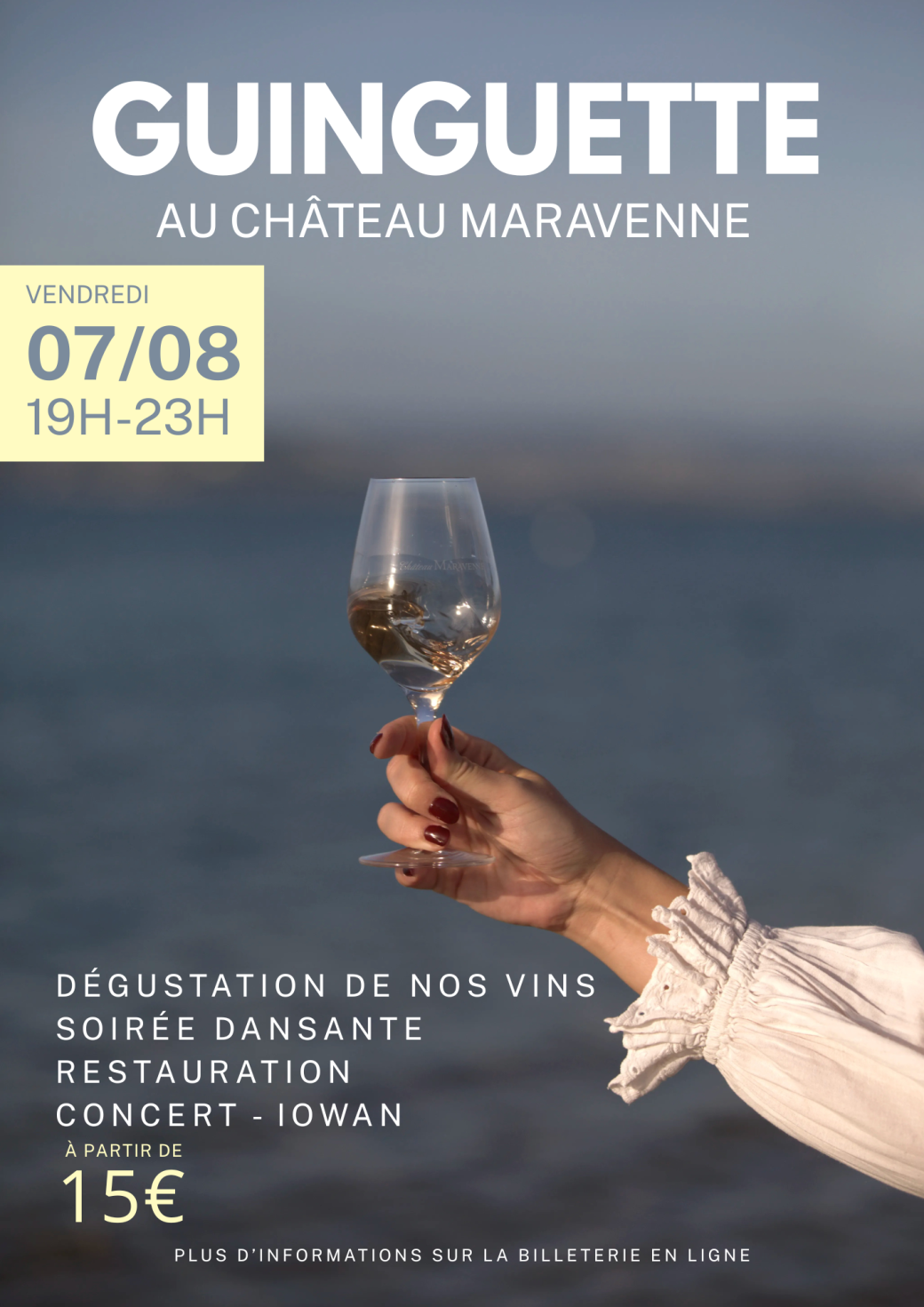 Venez profiter d’une soirée guinguette festive dans le cadre exceptionnel du domaine viticole Château Maravenne, avec une terrasse offrant une superbe vue mer.