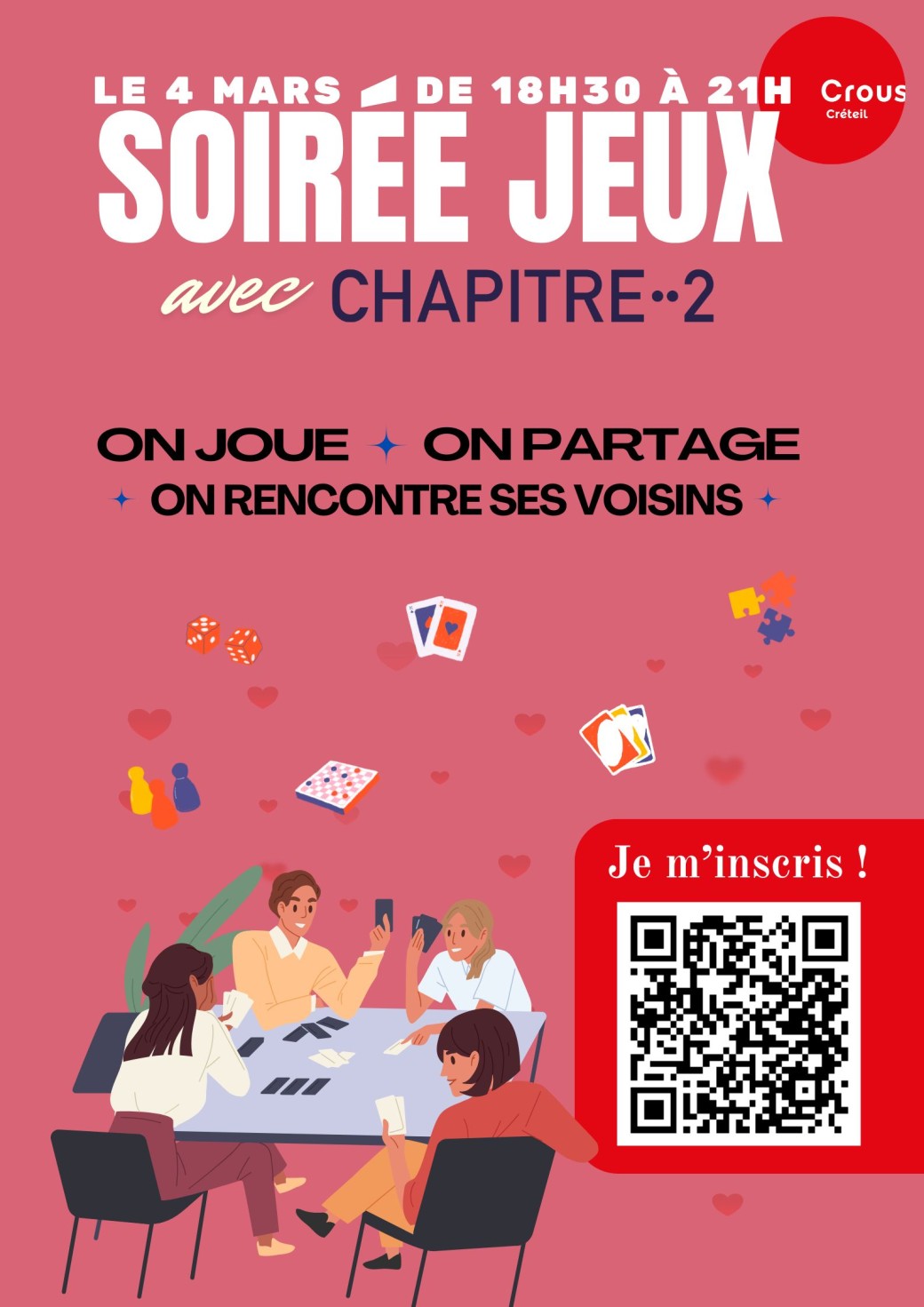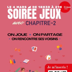 Le Service de la Vie Étudiante a le plaisir de t’inviter à une soirée jeux qui se déroulera le mercredi 4 mars de 18h30 à 21h30.
