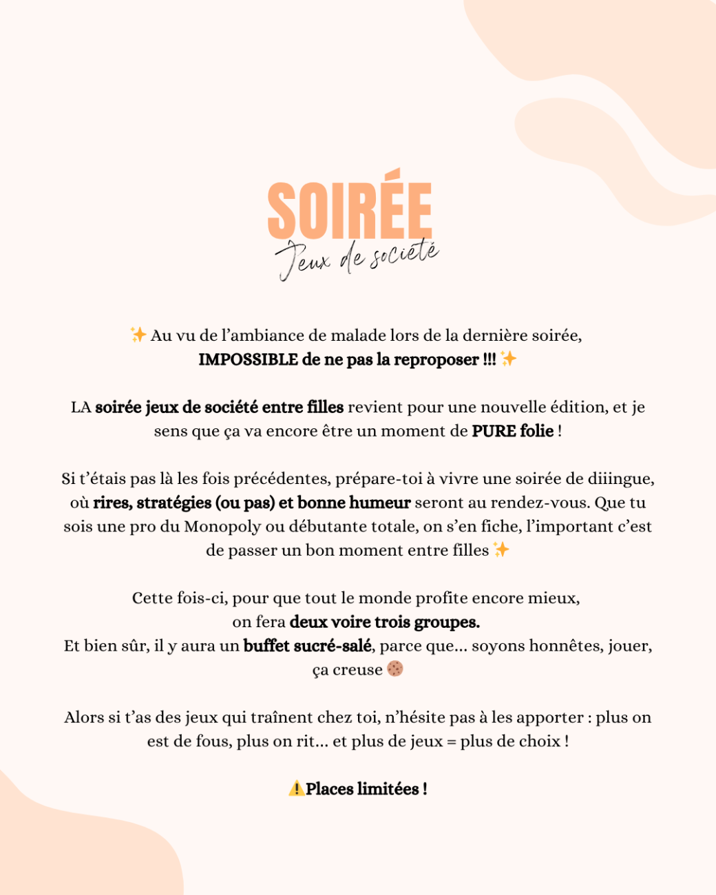 2025-11-21 19:30:00 2025-11-21 23:00:00 Europe/Paris Soirée Jeux de société Reservations on : https://www.billetweb.fr/soiree-jeux-de-societe71 --                     ------------------------------   ⚠️ ATTENTION :   En cas d’annulation, le billet ne pourra être remboursé. Cependant, si tu souhaites l'offrir ou le revendre à une copine / sœur / collègue, ceci est possible. Quoi que tu décides, pense à me tenir informé de ta décision. Merci pour ta compréhension & hâte de te retrouver ! ✨ 7VB Café Mulhouse, Place de la République, Mulhouse, France Entre Elles