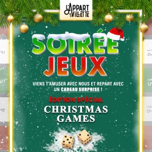 2024-12-14 20:30:00 2024-12-14 23:00:00 Europe/Paris Soirée jeux - spécial noël Reservations on : https://www.billetweb.fr/soiree-jeux-special-noel -- Soirée Jeux Spéciale Noël !   Rejoignez-nous pour une soirée festive et conviviale à l’Appart de la Villette le samedi 14 décembre de 20h30 à 23h !   Au programme : des jeux amusants, une ambiance chaleureuse et la magie de Noël. Chaque participant repartira avec un cadeau !   Ne manquez pas cette occasion de partager rires et bonne humeur en cette période de fêtes. Venez jouer et célébrer Noël avec nous ! 9 Avenue du Nouveau Conservatoire, Paris, France L'Appart de la Villette