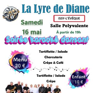 Reservations on : https://www.billetweb.fr/soiree-karaoke-dansant -- Soirée karaoké - Dîner dansant 20€/personne Salle polyvalente d'Issy l'Evêque Contacts Evelyne RAUX 06 63 78 78 89 Solène MAZILLE 06 11 73 26 18 lyredediane71@gmail.com