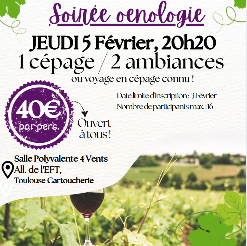 2026-02-05 20:20:002026-02-05 22:45:00Europe/ParisSoirée oenologie, 1 cépage / 2 ambiances - ou voyage en cépage connu !Reservations on : https://www.billetweb.fr/soiree-oenologie-1-cepage-et-2-ambiances-ou-voyage-en-cepage-connu