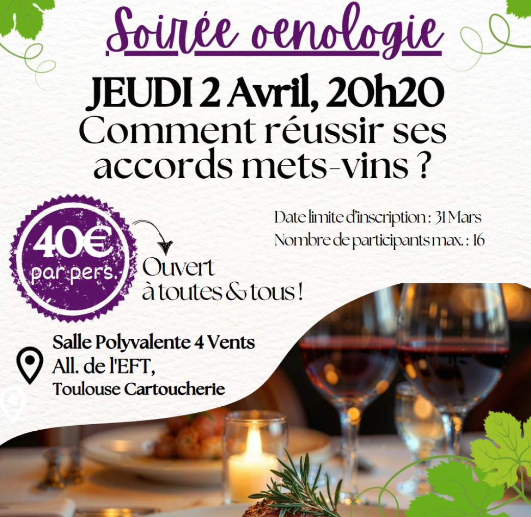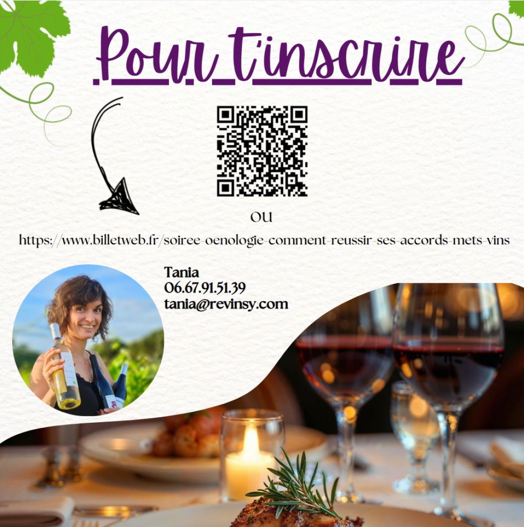 Reservations on : https://www.billetweb.fr/soiree-oenologie-comment-reussir-ses-accords-mets-vins --