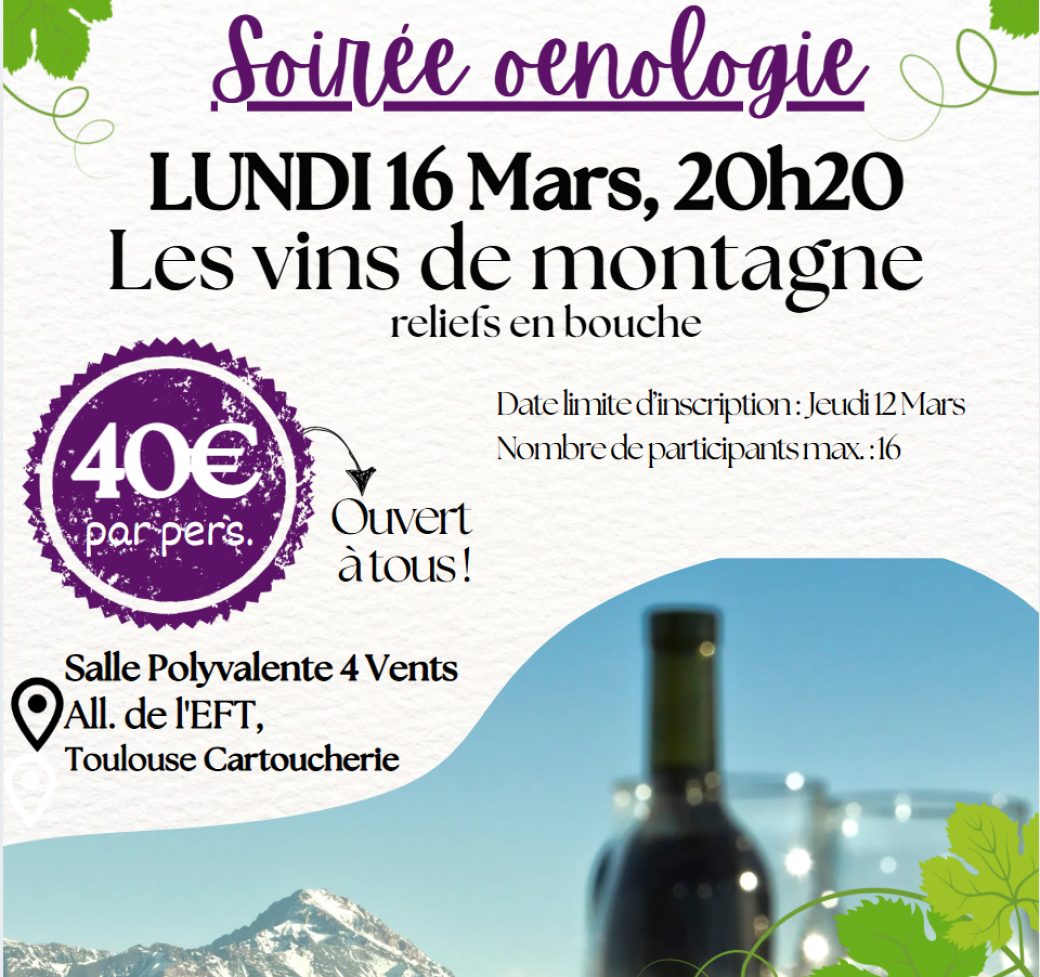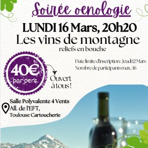 2026-03-16 20:20:002026-03-16 22:45:00Europe/ParisSoirée oenologie, les vins de montagne - ou reliefs en bouche !Reservations on : https://www.billetweb.fr/soiree-oenologie-les-vins-de-montagne-ou-reliefs-en-bouche