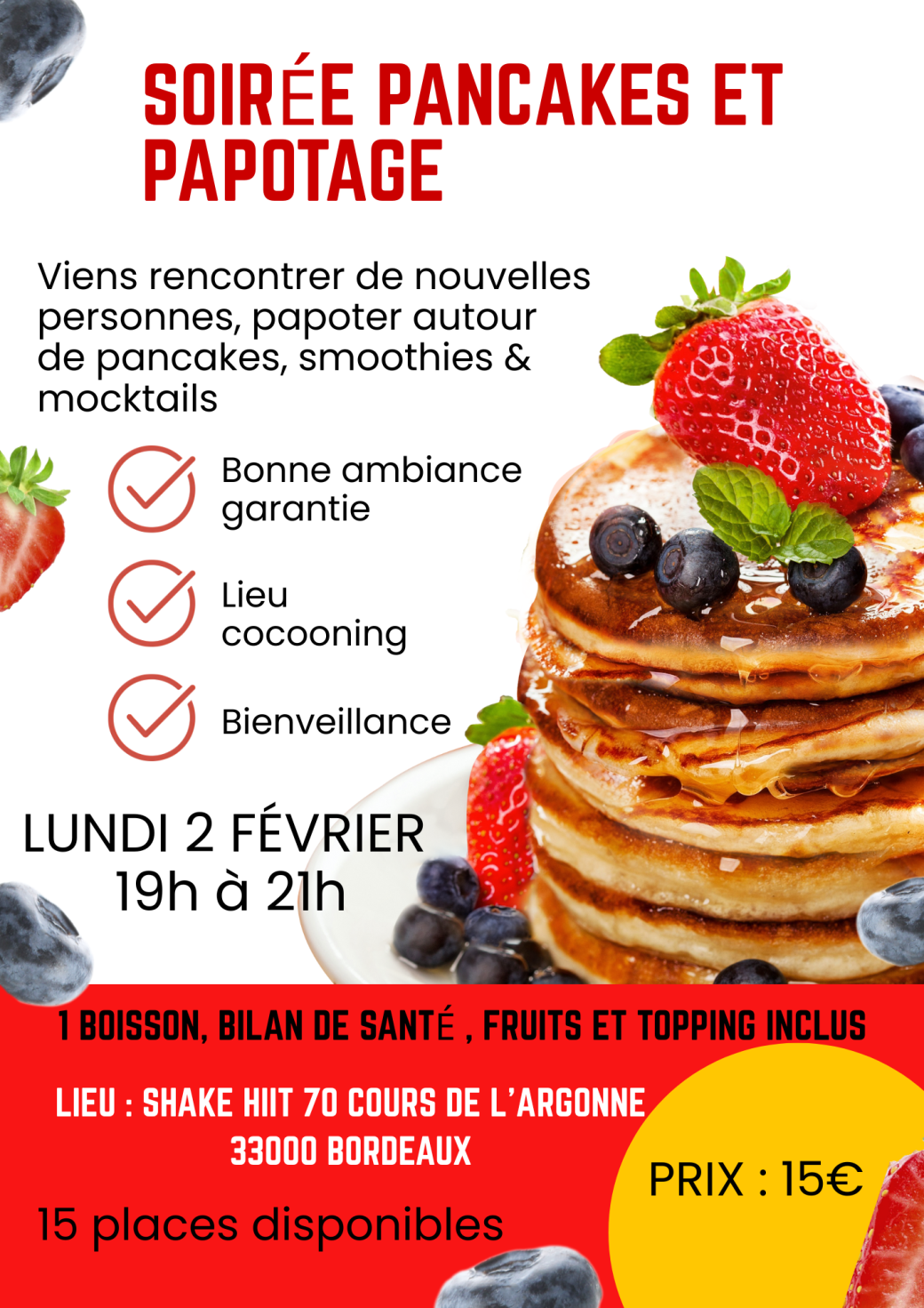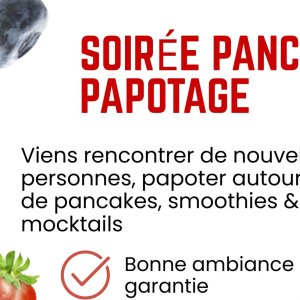 Voici ton nouveau rendez-vous à noté dans ton agendas. Le lundi 02 Février de 19h à 21h viens rencontrer de nouvellles personnes autours de pancakes, de smoothie et de mocktail tout ça dans une ambiance cocooning.