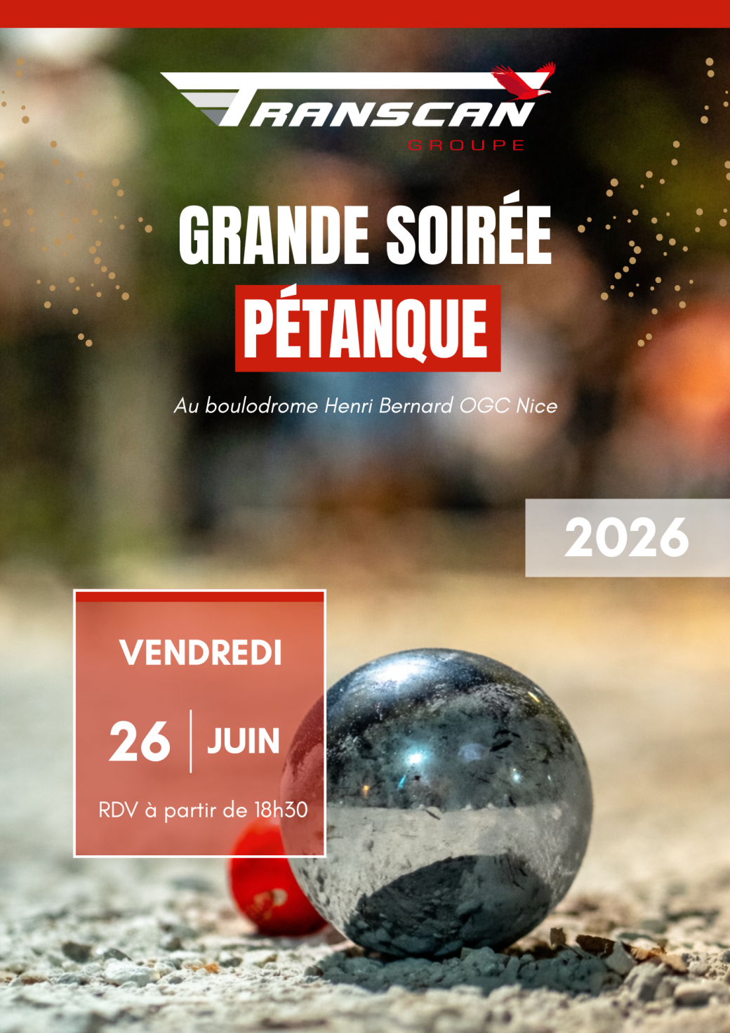 2026-06-26 18:30:002026-06-27 00:00:00Europe/ParisSoirée pétanque Groupe Transcan 2026Reservations on : https://www.billetweb.fr/soiree-petanque-groupe-transcan-2026