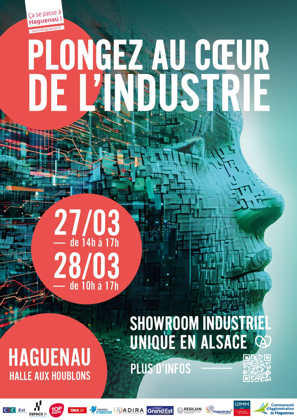 « Plongez au cœur de l’industrie » est une manifestation organisée par la Communauté d'Agglomération de Haguenau et l’UIMM Alsace, en partenariat avec la Ville de Haguenau, la Région Grand Est, Résilian, l'Adira, CIC Est, l'Espace H, les DNA, Top music et Territoires d'Industrie
