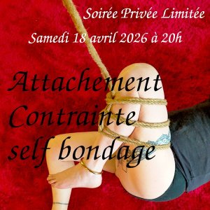 Saisissez votre descriptionSoirée Attachement – Contrainte - self bondage. Soirée privée dans un lieu sécurisé et équipé, croix de st André, bancs à fessés, plus des points de fixations à différents endroits de la salle. Emmener votre matériel personnel. Personne seule accepté. Lien vers une billetterie web une fois inscription par message privé uniquement. Seule les billets font foi de participation à la soirée. L’adresse précise vous sera communiquer une fois le billet validé. Nous demandons à chaque participant d’emmener pour la soirée un plat sucré ou salé. L’apéritif ainsi que les boissons (non alcoolisées) seront offertes. Soirée organisée par L'association « Les Sales Gosses brats ».