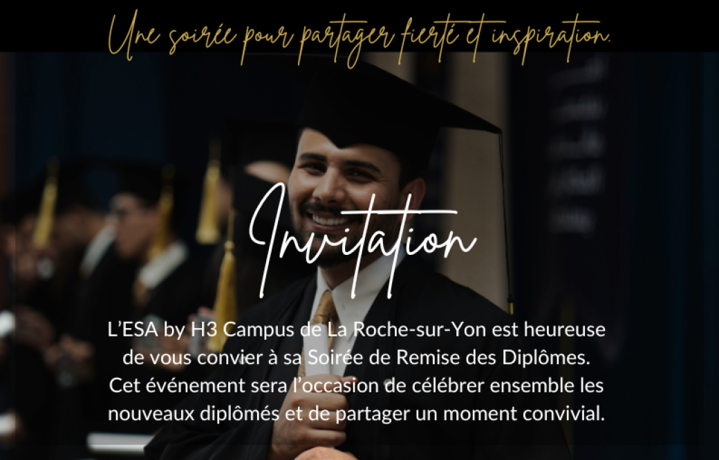 2025-11-20 19:00:002025-11-20 23:00:00Europe/ParisSoirée remise de diplômes 2025 - ESA by H3 Campus LRSYReservations on : https://www.billetweb.fr/soiree-remise-de-diplomes-2025-esa-by-h3-campus-lrsy-tudiants