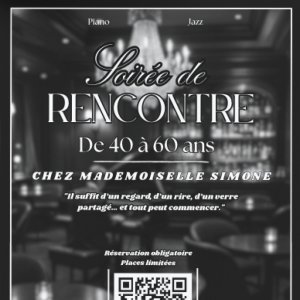Bienvenue chez Mademoiselle Simone, pour une soirée conviviale dédiée aux célibataires de 40 à 60 ans, dans une ambiance jazzy et feutrée.