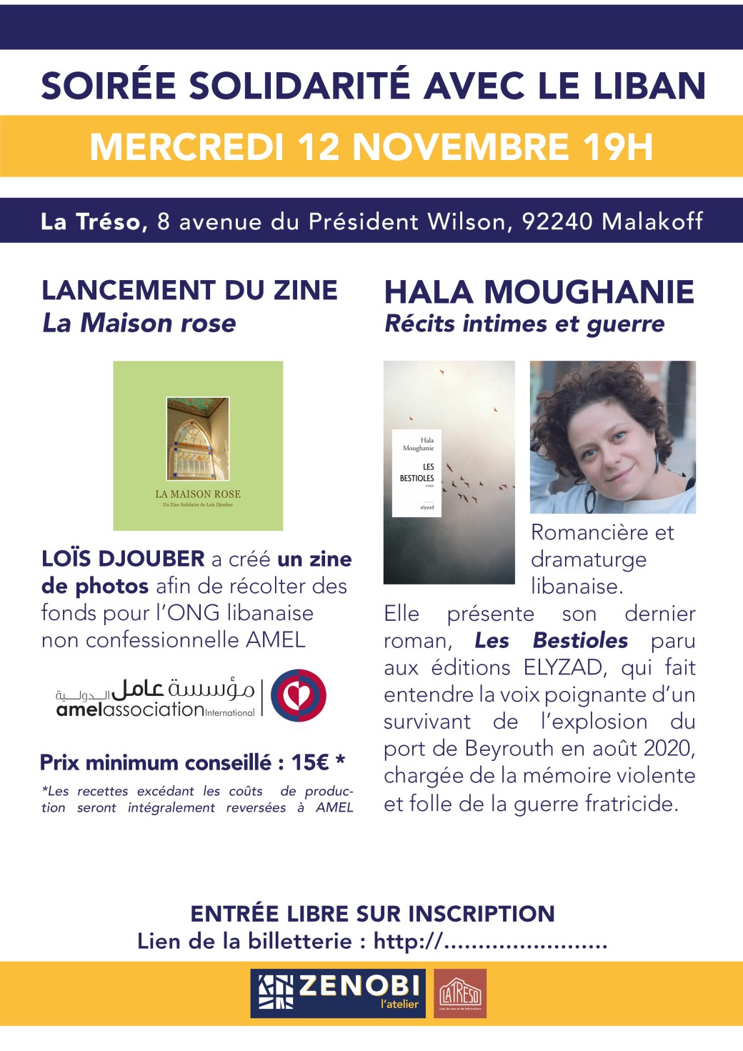 Cette soirée de soutien sera l’occasion d’échanger autour des enjeux de la mémoire collective en temps de guerre, à travers récits intimes et images du quotidien. Dans ce cadre, l'atelier ZENOBI a invité la romancière et dramaturge libanaise Hala Moughanie qui nous fera l’honneur de présenter son dernier livre, Les Bestioles, paru récemment aux éditions Elyzad.