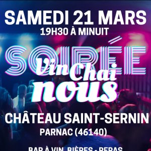 Nous vous donnons rendez-vous le samedi 21 mars à partir de 19h30 pour notre soirée Concert - Vin Chai Nous !