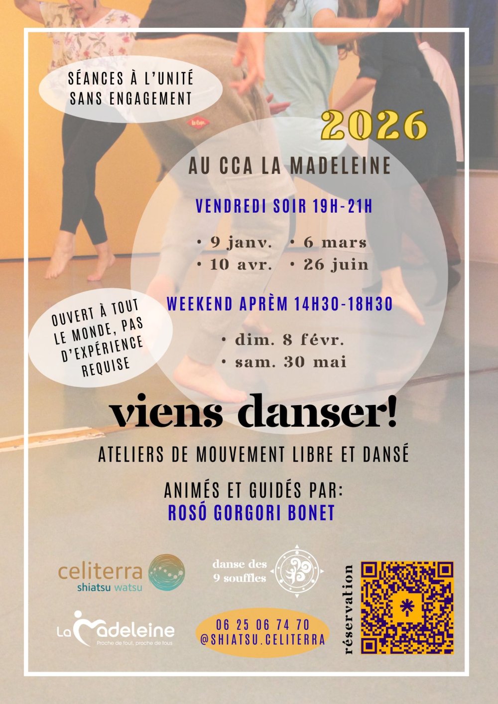 Nous nous retrouvons pour la troisième année au Centre de Culture et d’Animation (CCA) le Millénaire, à La Madeleine, pour danser et bouger librement au rythme de la musique et du mouvement naturel du corps.