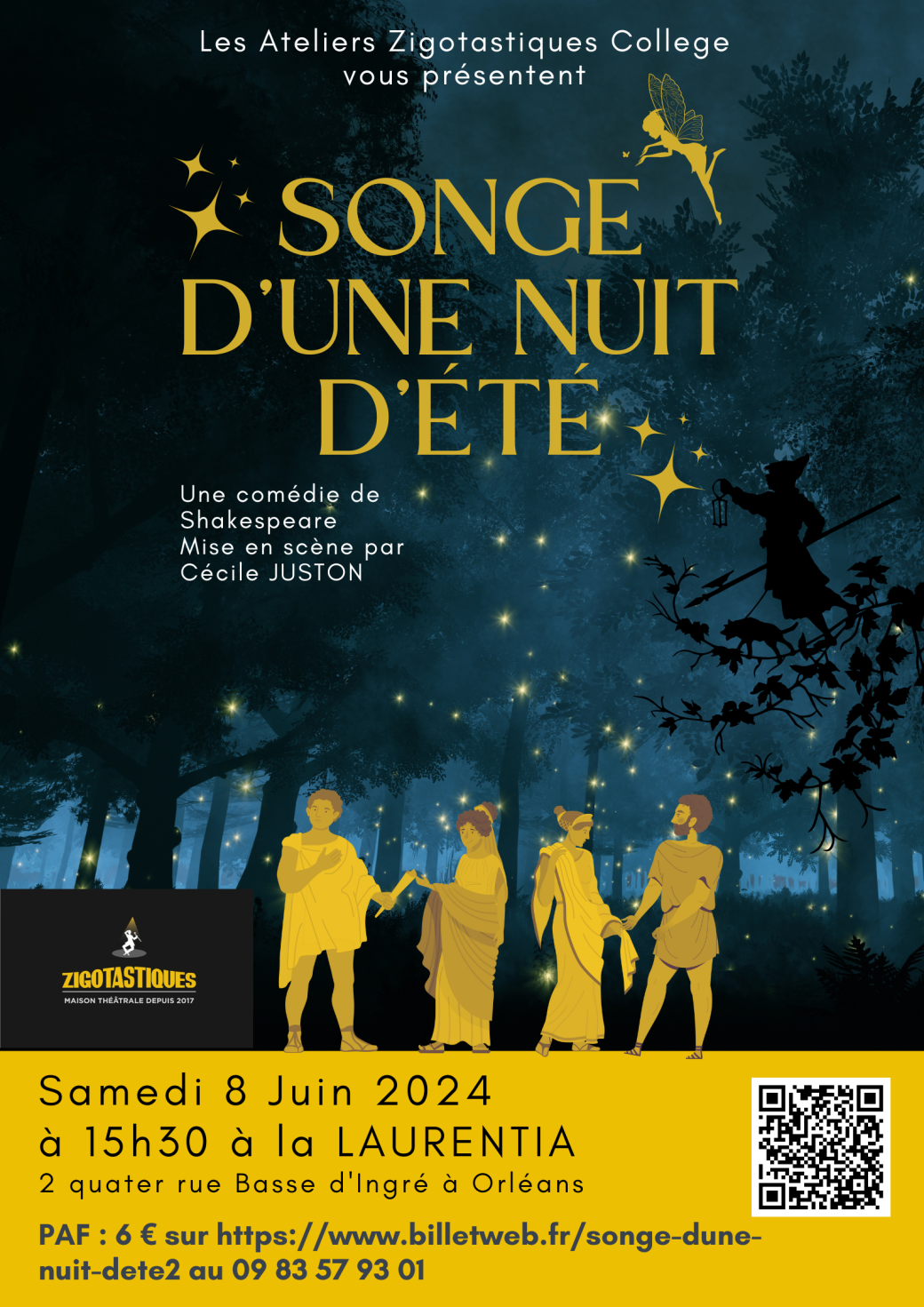 Plongez dans l'univers magique de "Songe d'une nuit d'été" de Shakespeare. Cette comédie enchanteresse vous transporte dans une forêt mystique où s'entremêlent amour, humour et magie. Entre fées espiègles, amoureux perdus et artisans maladroits, laissez-vous emporter par une soirée pleine de rires, de quiproquos et de charmes enchanteurs. Une expérience théâtrale unique, pleine de surprises et de moments magiques à ne pas manquer !