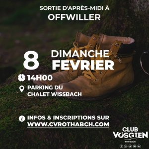 Dimanche 8 février, le Club Vosgien de Rothbach propose une sortie d’après-midi au départ d’Offwiller. Rendez-vous à 14h au parking du chalet Wissbach, pour une randonnée de 3h00 environ, ouverte à tous et sans difficultés particulière.