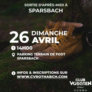 Dimanche 26 avril, le Club Vosgien de Rothbach organise une sortie d’après-midi à Sparsbach. Départ à 14h au parking dsu satde de foot de Sparsbach pour une randonnée ouverte à tous et sans difficultés particulières d’une durée de 3h et 11,5km environ.