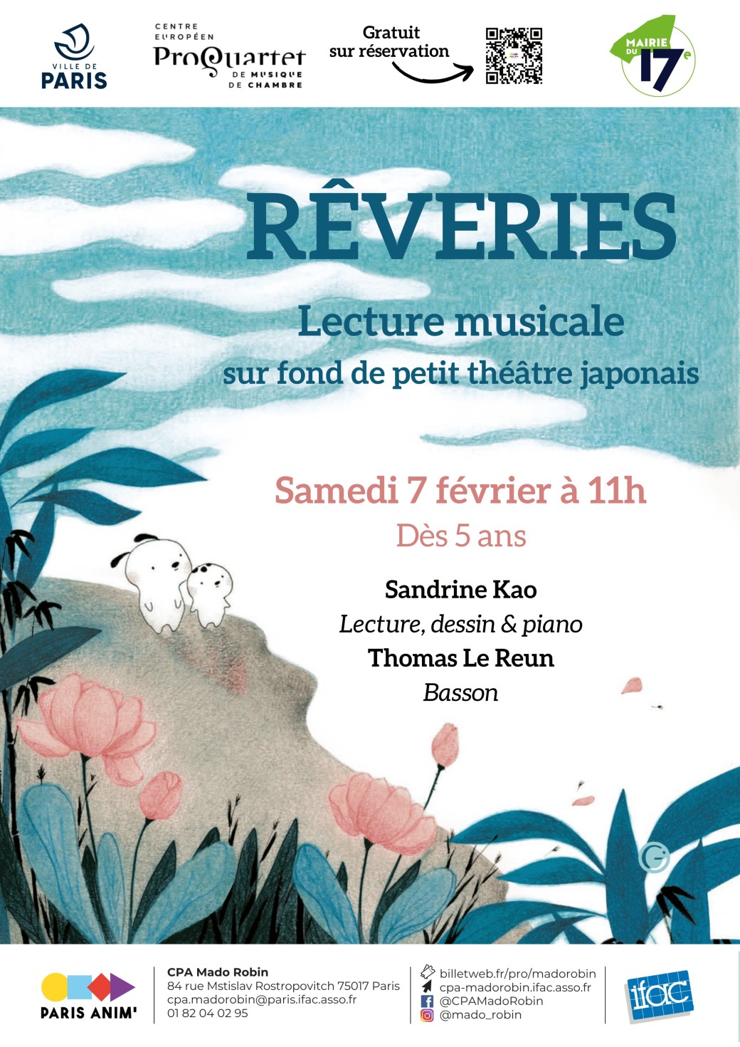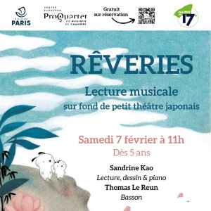 Le centre européen Pro Quartet de musique de chambre propose une matinée musicale pour les plus petits à partir de 5 ans. Les illustrations de Sandrine Kao viendront résonner au son du piano et du basson de Thomas Le Reun. Une pause en musique et en poésie à vivre en famille.