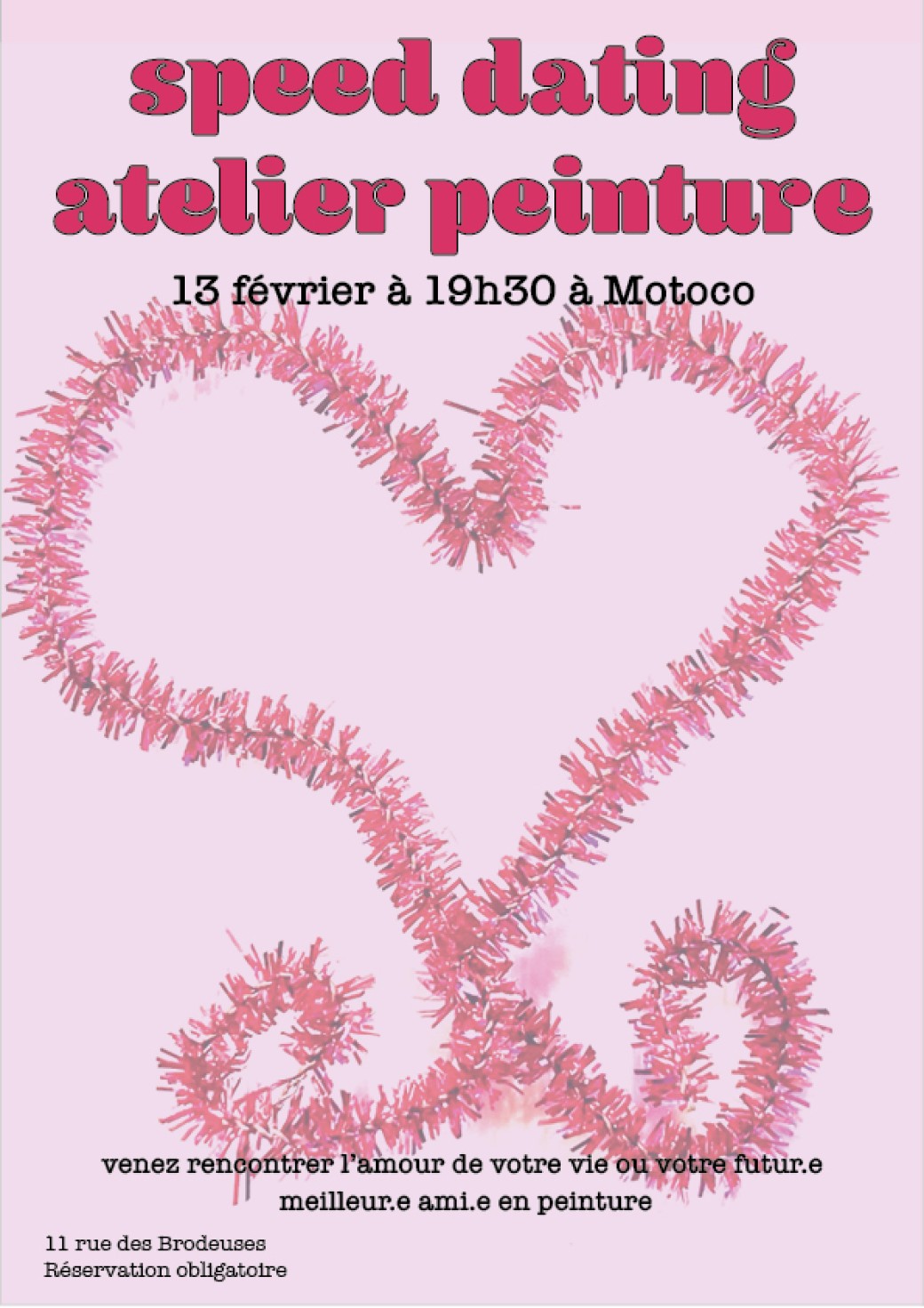 Le speed dating peinture se déroulera en 6 rencontres (environ 2h), et par la suite un buffet sera mis à disposition pour grignoter un bout et approfondir la rencontre.