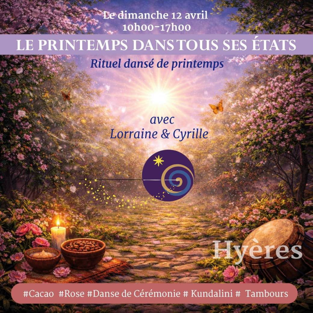 Je suis en joie d'accueillir à nouveau Cyrille Chantereau et sa compagne, Lorraine Sartelet, dans notre salle de Hyères pour un rituel dansant pour accueillir le Printemps! Voici ci-dessous leur proposition: