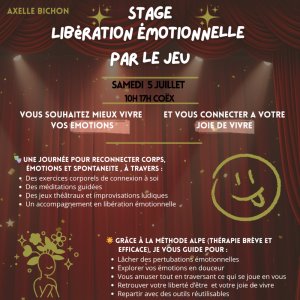 Ce stage permet de s'amuser, se reconnecter à sa joie, tout en libérant des émotions bloquées définitivement.
